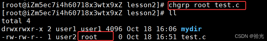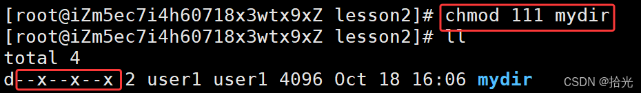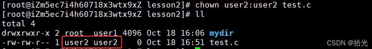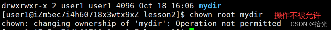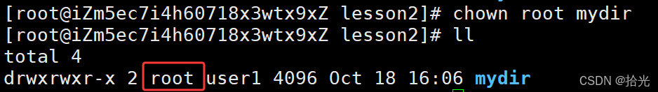 在root账号下,我们成功将mydir目录的拥有者改为了root用户
