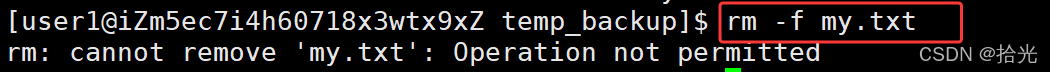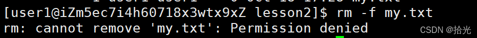 此时,user1删除user2创建的my.txt文件就会被拒绝: