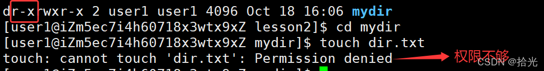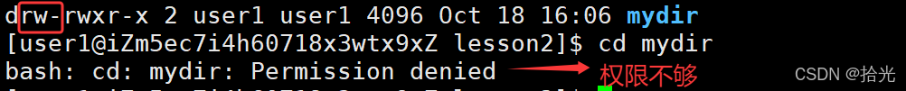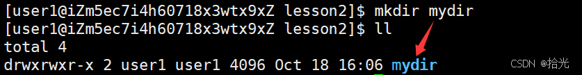 首先我们用普通用户user1创建一个目录,指令:mkdir mydir