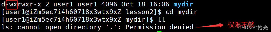 我们先用指令:chmod u-r mydir,取消拥有者的 r 权限,然后用指令:cd mydir,切换到mydir目录,再用指令:ll,查看目录详情。