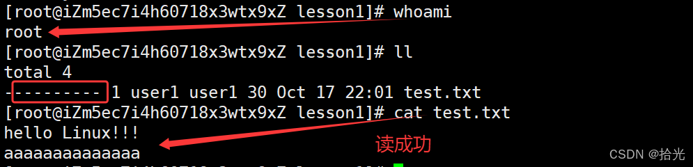 root为other,虽然other没有任何权限,但是root用户任然能够读文件。即root用户不受权限约束。