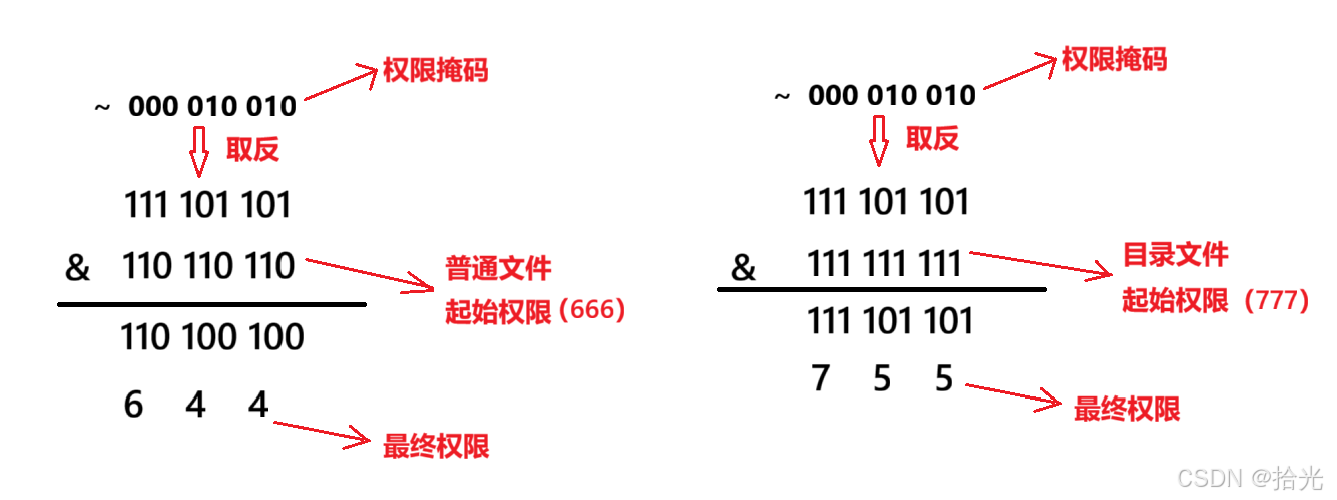 对于普通文件来说,起始权限为666,默认不可执行;对目录文件来说,起始权限为777,默认携带x权限。但如上图所示,普通文件起始权限不应该是 644 吗?目录文件起始权限不应该是755 吗?