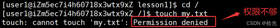 我们先切换到根目录,指令:cd /,然后在根目录下创建文件:my.txt,这时由于普通用户权限低,就会创建失败。