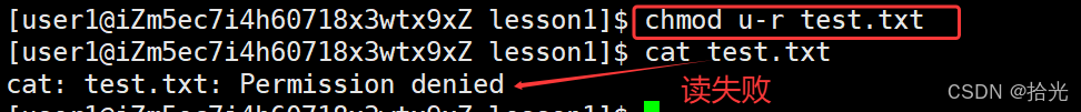 我们先将拥有者的所有权限取消,然后对文件test.txt读或者写,看系统是否拒绝我们访问