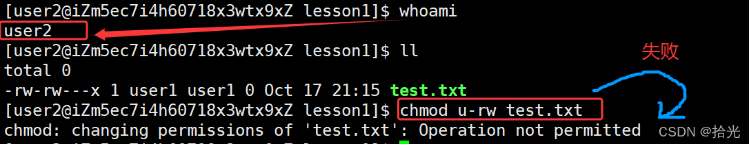 💦测试一:假设另外有一个user2普通用户,能不能修改test.txt文件的权限?