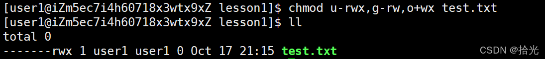 • chmod指令支持逗号指令:chmod u-x, g-x, o+rw test.txt