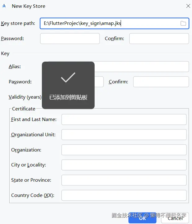 Certificate:为证书输入一些关于您本人的信息。此信息不会显示在应用中,但会作为 APK 的一部分包含在您的证书中。只有第一项是必须填的,其它的空着就行。当然了,如果写全了更好。