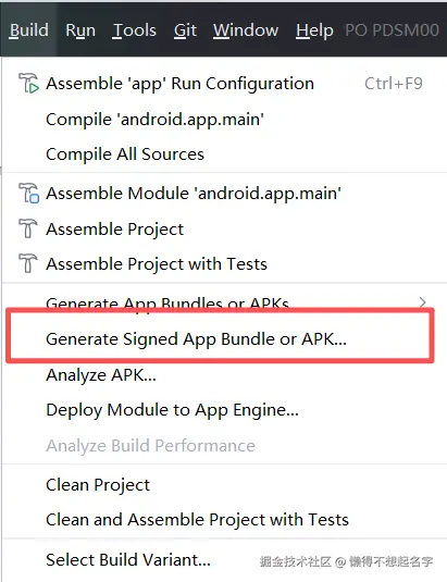 2. 点击 android studio 界面左上方 Build>Generate Signed Bundle / APK , 选择 APK 然后 next 。