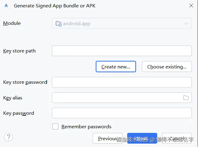 Key store path: 是你要将 key 保存在哪里,可以先找个地方放,后面可以 copy 到其它地方。 Password:为您的密钥库创建并确认一个安全的密码。