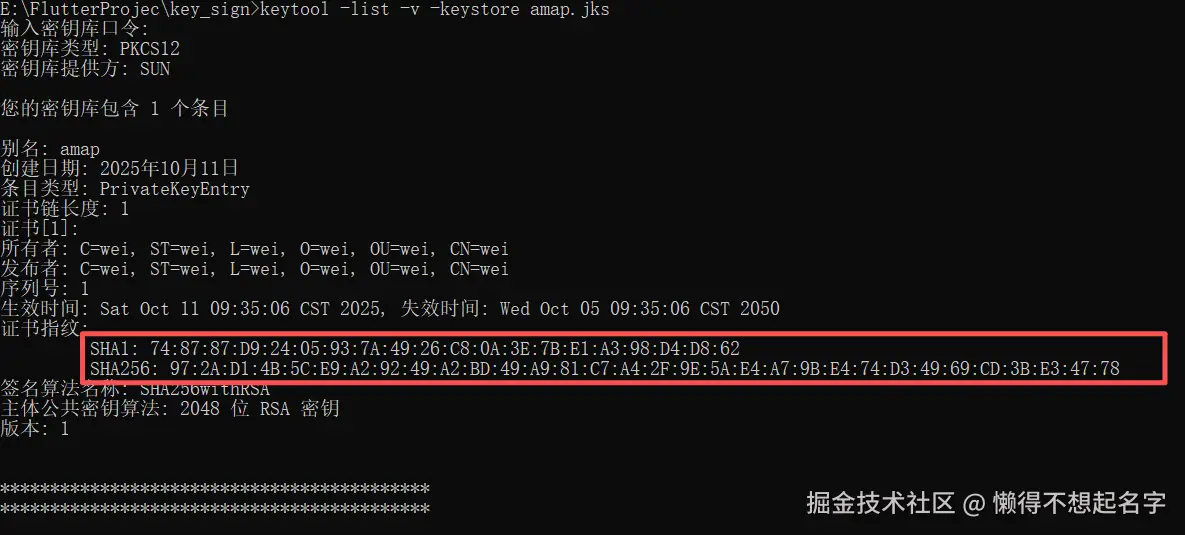 。提示输入密钥库口令,发布模式的密码是为 apk 的 keystore 设置的密码 。这时就能在控制台中看到该证书的 SHA1。