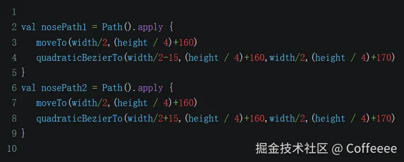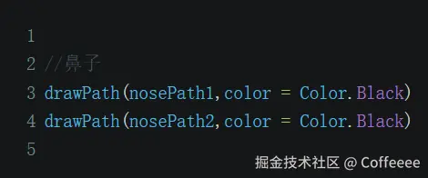 然后是鼻子,鼻子也是由两个三阶贝塞尔曲线构成,曲线的控制点坐标取值如下