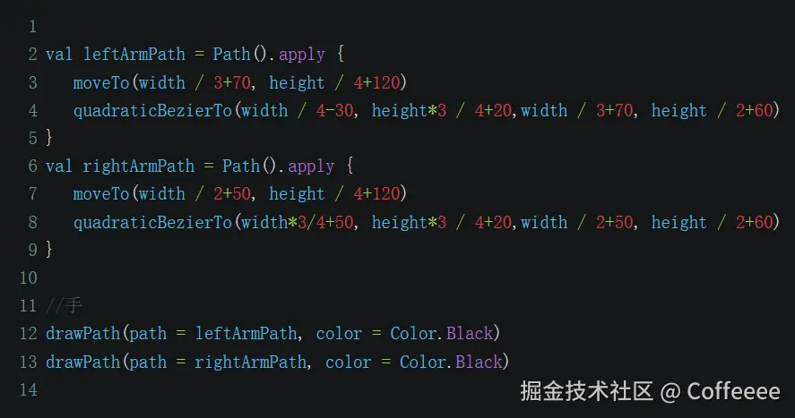 然后需要画出双手,两只手是斜着向下的,所以没法用任何一个几何图形来表示,只能画两根贝塞尔曲线,这里的贝塞尔是三阶曲线,每根曲线需要找出三个控制点,三个控制点中,首尾的坐标可以参考脑袋topLeft