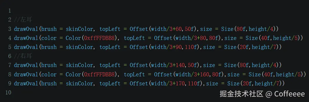 的坐标,内耳的坐标就是向右偏移一些距离,左耳绘制完毕后,右耳基本一样,将代码拷过来,所有topLeft