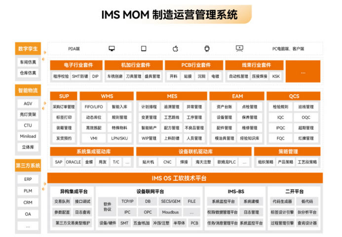 盘古信息IMS V6系统基于自主研发的IMS OS技术底座,采用先进的Spring Boot、Vue 等主流开发框架,支持多工厂、多组织协同管理,具备高度的可扩展性和灵活性。同时,包含 WMS 仓库管理系统、MES 制造执行系统、EAM 企业资产管理系统、QCS 质量控制系统等主业务系统,具备技术底蕴与行业积淀双重保障: