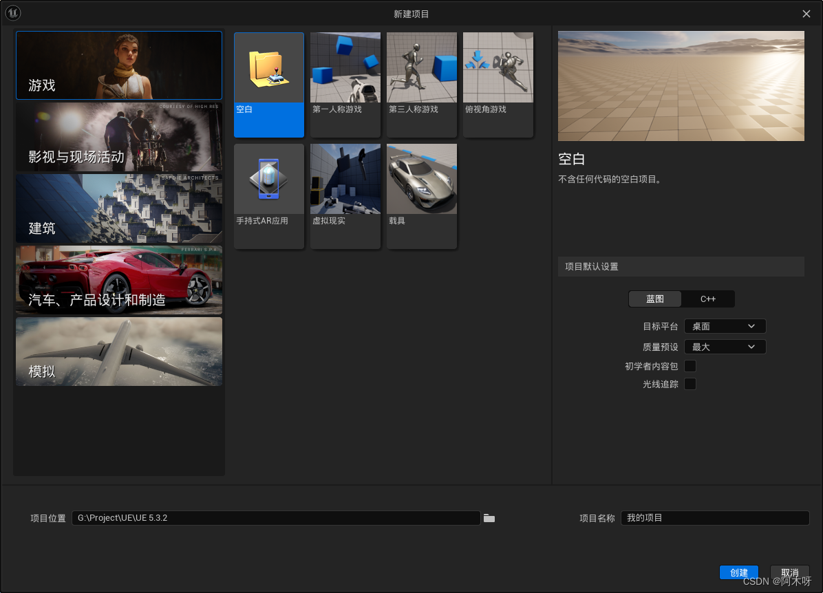 5.创建第一个虚幻引擎项目(以UE5为例,UE4同理)
