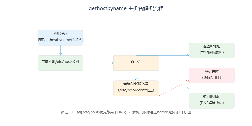 结构体的字段含义,尤其是IP地址的网络字节序处理; - 熟悉解析流程(本地文件→DNS),能快速排查解析失败问题;