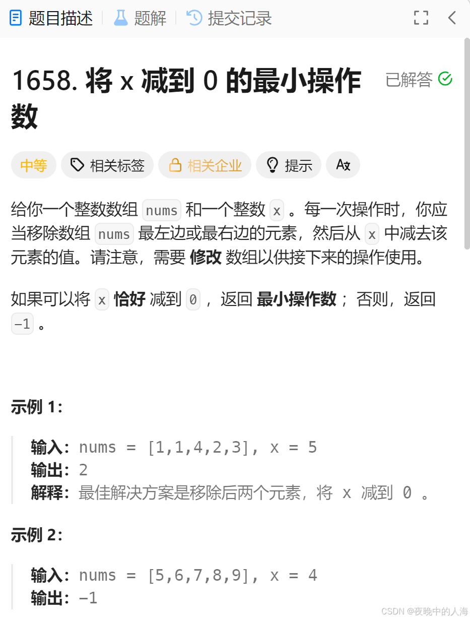 由于题目要求的是减去数组左或右两端连续的和为x的最短数组,如果按照题目的要求那我们解决这个问题就比较棘手,由于我们不知道它是减去左边的还是减去右边的,或者连续减去左边等情况,因此我们可以将其进行转化为数组内一段连续的和为sum(nums) - x的最长数组,使用滑动窗口的解法,然后用整个数组的大小减去该段最长数组的大小,我们就得到了题目要求的最短操作数了