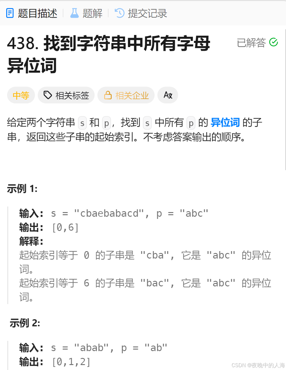 滑动窗口+ 哈希表 ,由题可知,字符串p的异位词的长度⼀定与字符串p的长度相同,所以可以在字符串s 中构造⼀个长度为字符串p的长度相同的滑动窗口,用哈希表记录字符串p中字符出现的个数,用一个变量count记录长度,不断进窗口 ,如果大于异位词的长度并且出现的字符在字符串p中也有(判断条件 ),就出窗口 ,让count--,相反就让count++,如果等于字符串p的长度就更新结果