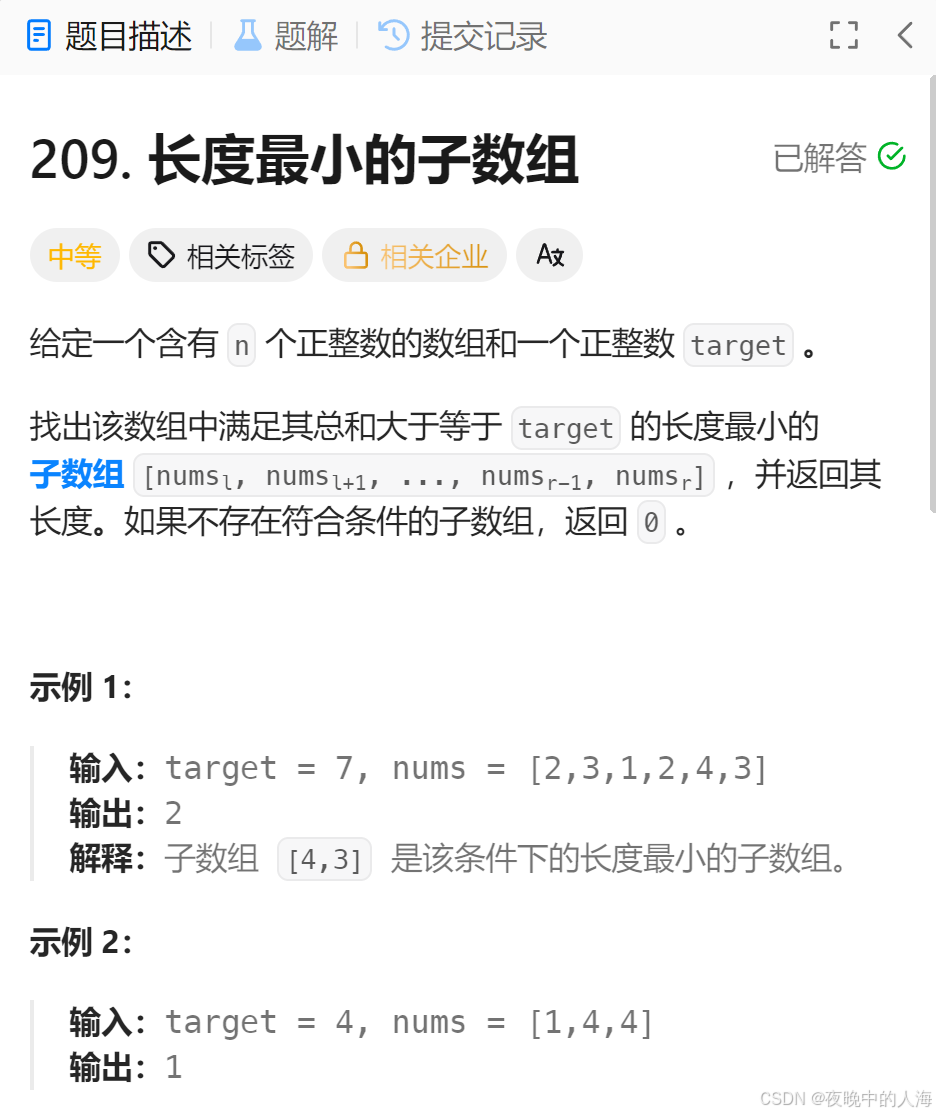 1.暴力枚举,枚举任意一个数字当作起始位置,然后从这个位置开始寻找一段最短区间满足 >= target(注:这方法会超时,效率低)