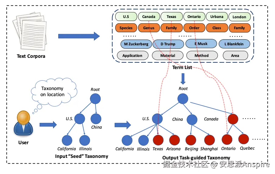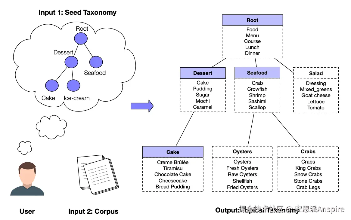 任务引导的分类法构建。用户提供一个"种子"分类树作为任务指导,我们将从原始文本语料库中提取关键术语,并自动生成所需的分类法。[来源]