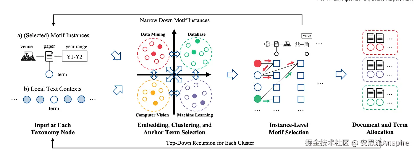 TaxoGen将相关术语归为一个单一主题,使分类法更具信息性。它首先将术语转换为嵌入向量以捕捉其含义,然后使用一种特殊的聚类方法,逐步将宽泛的主题细分为更具体的主题,同时确保通用术语位于较高层级,具体术语位于较低层级。为了在较小主题的术语之间做出更精细的区分,TaxoGen仅使用与该主题相关的文档来学习新的嵌入向量,从而能够区分细微差异。这种方法完全自动化,比以前的方法创建的分类法更清晰、更有用,有助于用户和系统更好地浏览和理解大型文本数据集。
