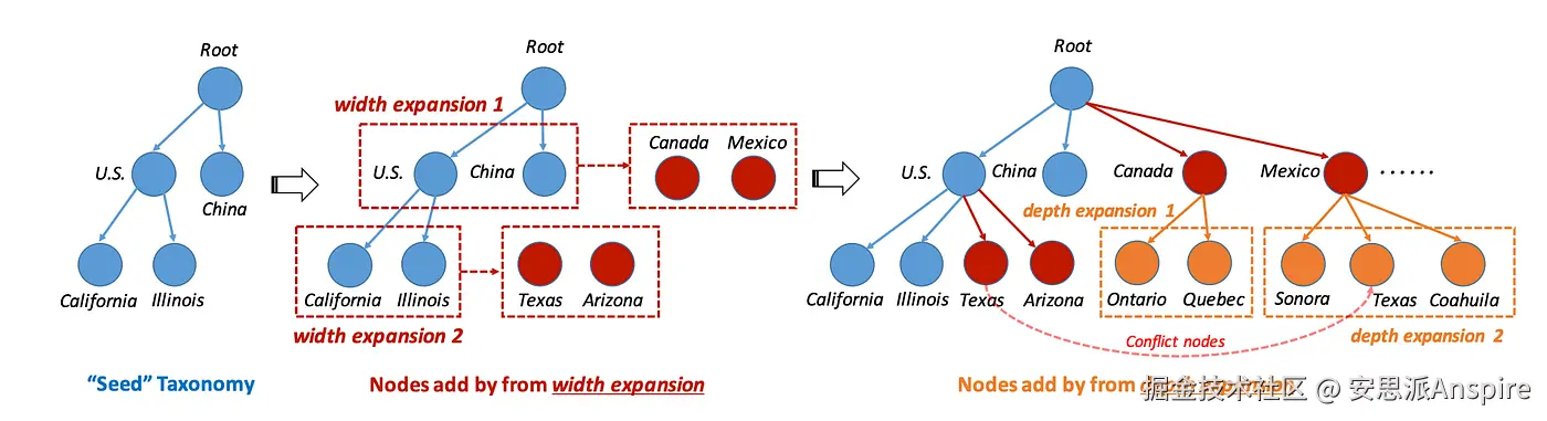 分类法构建始于一个基本结构,称为"种子"。不同的方法会在广度和深度上扩展这个种子,随后再调整整体结构。