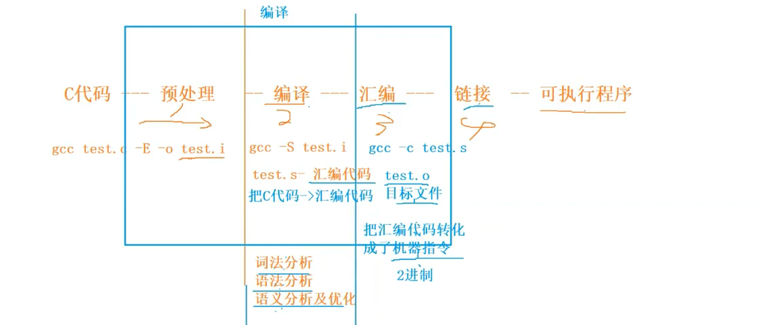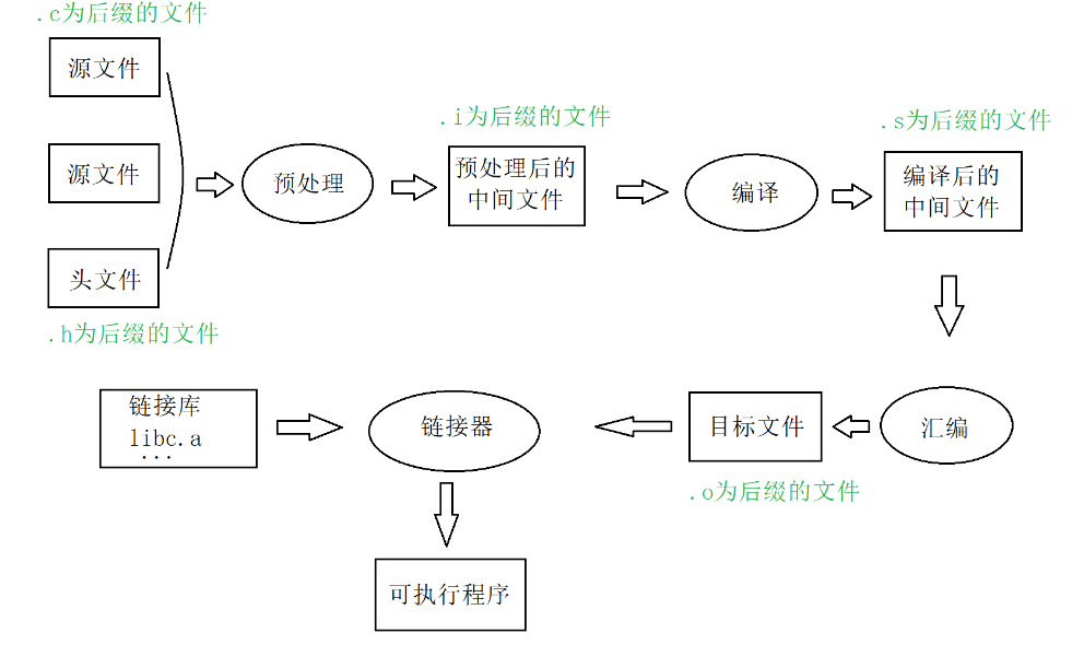 执行顺序:C代码 --- 预处理 --- 编译 --- 汇编 --- 链接 --- 可执行程序