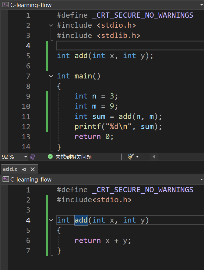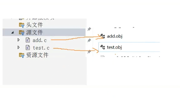 当有两个甚至多个.c文件时,编译器是先把每个函数的链接合并到一起,然后再使用,如下图中的加法函数: