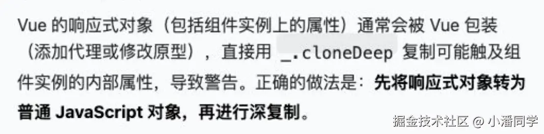在查询的过程中发现是数据的响应式导致了无法深度复制。那根据上面的说法是可以将响应式对象转化成普通JS对象来对数据进行深拷贝。