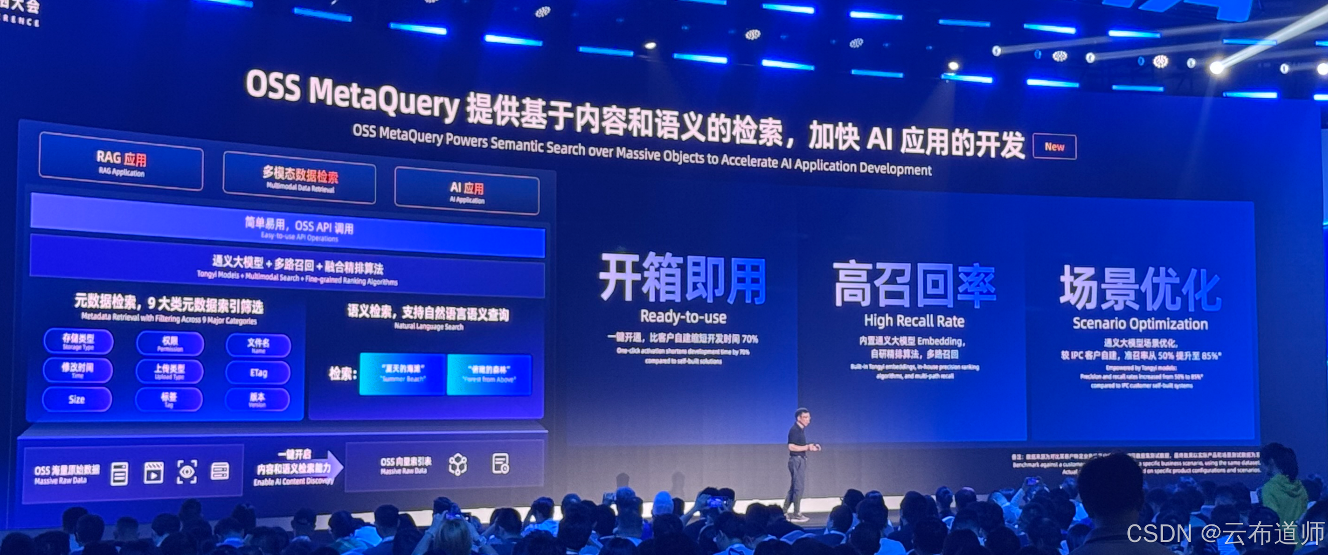 近日,在云栖大会上阿里云 OSS MetaQuery(数据索引)全新升级,支持基于内容和语义的智能检索,面向安防监控、智慧社区、智能零售等场景。企业可快速开启该能力,无需自建基础设施或优化模型,即可自动完成视频、图片、文档等非结构化数据的向量化与索引构建,基于成熟的精排算法和多路召回机制,有效提升检索准确率与召回率,轻松实现 RAG 多模态语义检索和 AI 应用,标志着 OSS 迈入 AI 原生数据管理新时代。