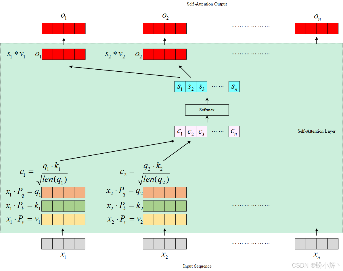 如图所示,每个单词通过三个可训练参数矩阵 ( P q P_q Pq、 P k P_k Pk、 P v P_v Pv) 生成三组向量:查询向量 (
