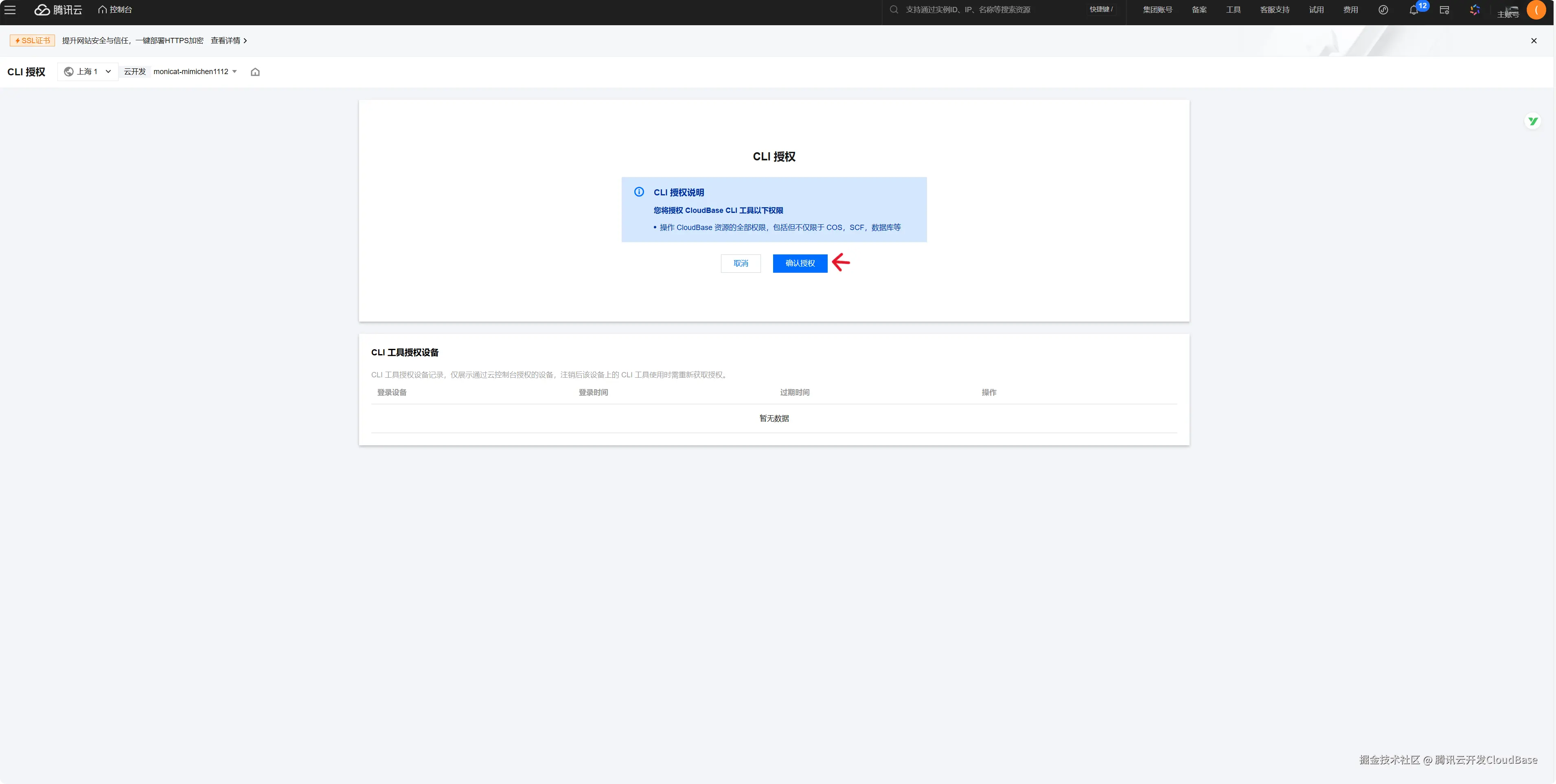 弹出云开发控制台网页,在网页中确认授权并选择环境。