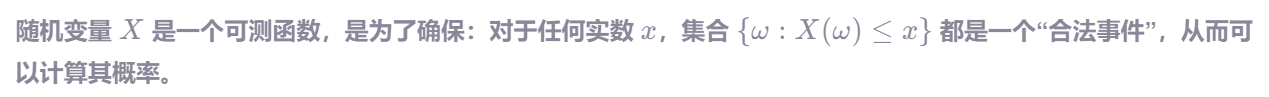 ✅ 这保证了 P(X≤x)=P({ω:X(ω)≤x})\mathbb{P}(X \leq x) = P(\{\omega : X(\omega) \leq x\})P(X≤x)=P({ω:X(ω)≤x}) 总是有定义的!