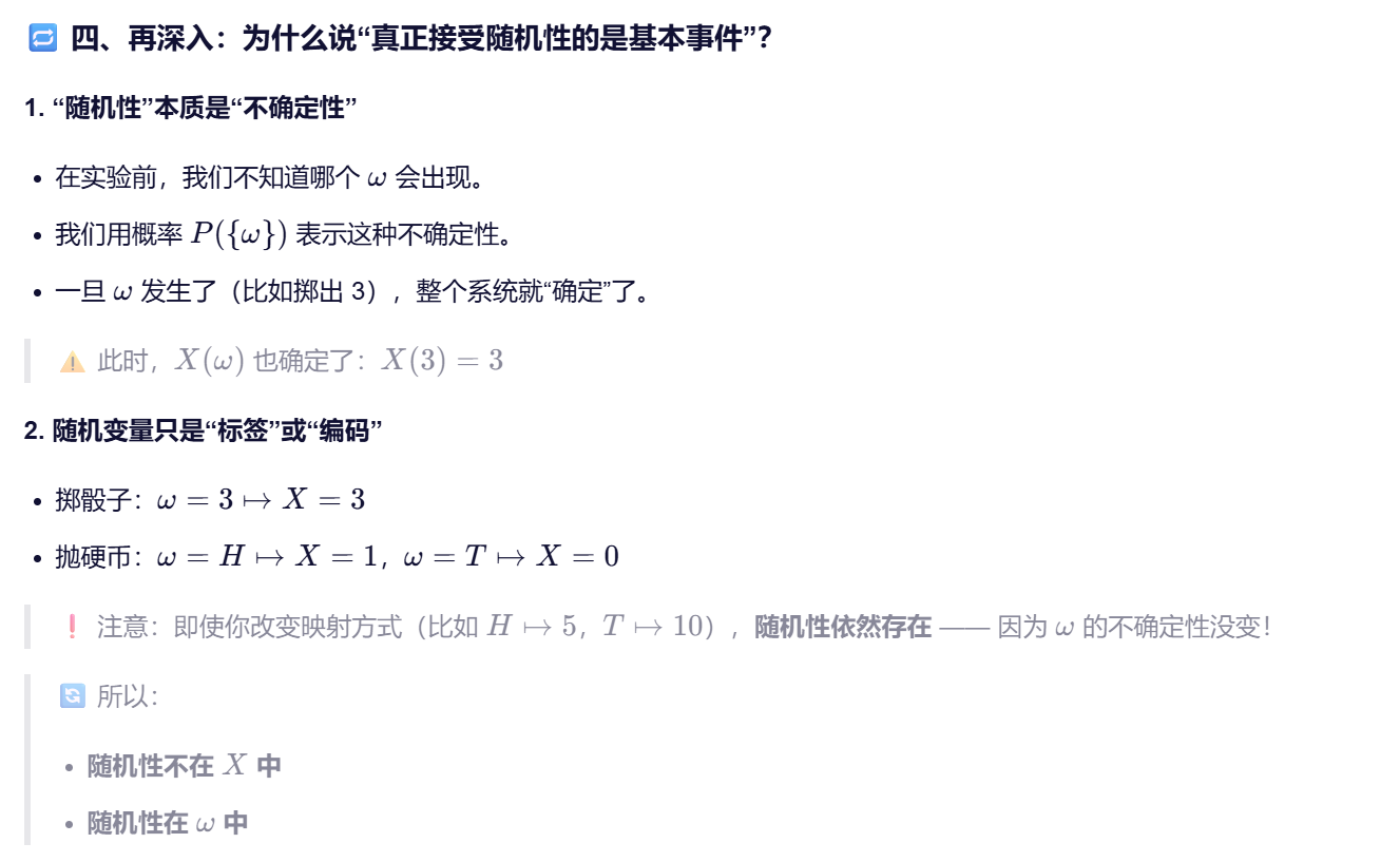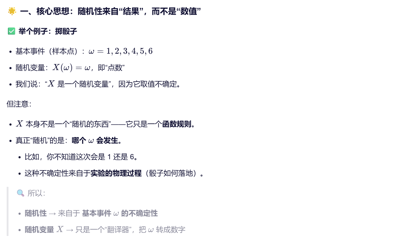 ✅ 所以,随机性的源头是基本事件 ωωω,而随机变量 XXX是连接"现实世界"与"数学世界"的桥梁。