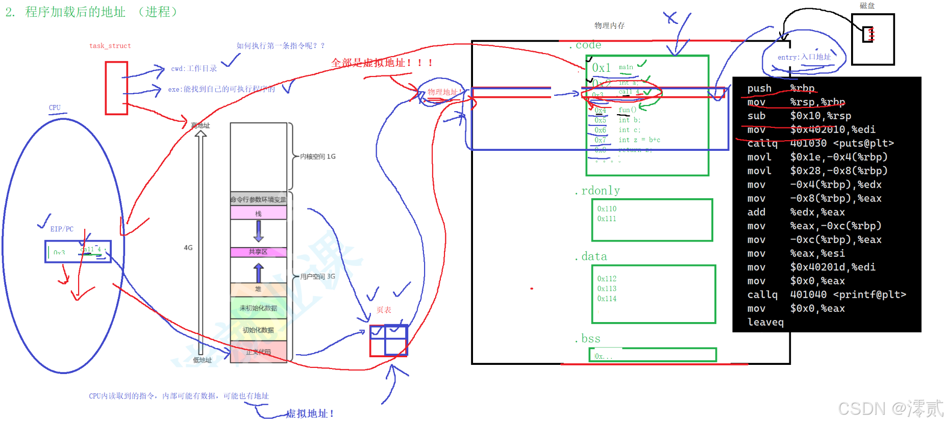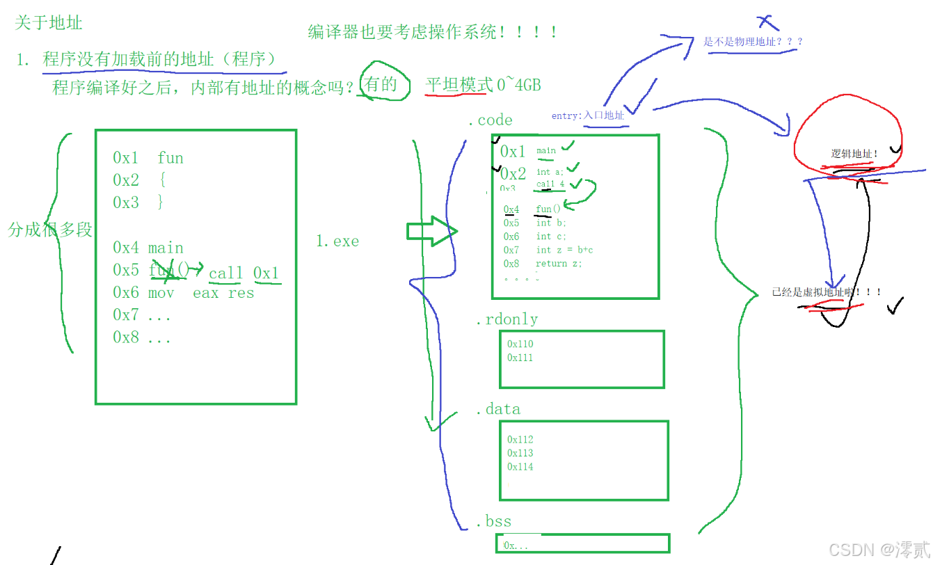 在程序还未加载到内存之前,系统会提前在内存以平坦模式分布好,平坦模式就是按照进程地址空间里的分布将代码的机器指令的逻辑地址排布好,逻辑地址本质上就是虚拟地址,只不过在磁盘里是这么称呼而已。当需要执行时会去查找对应可执行程序的 entry