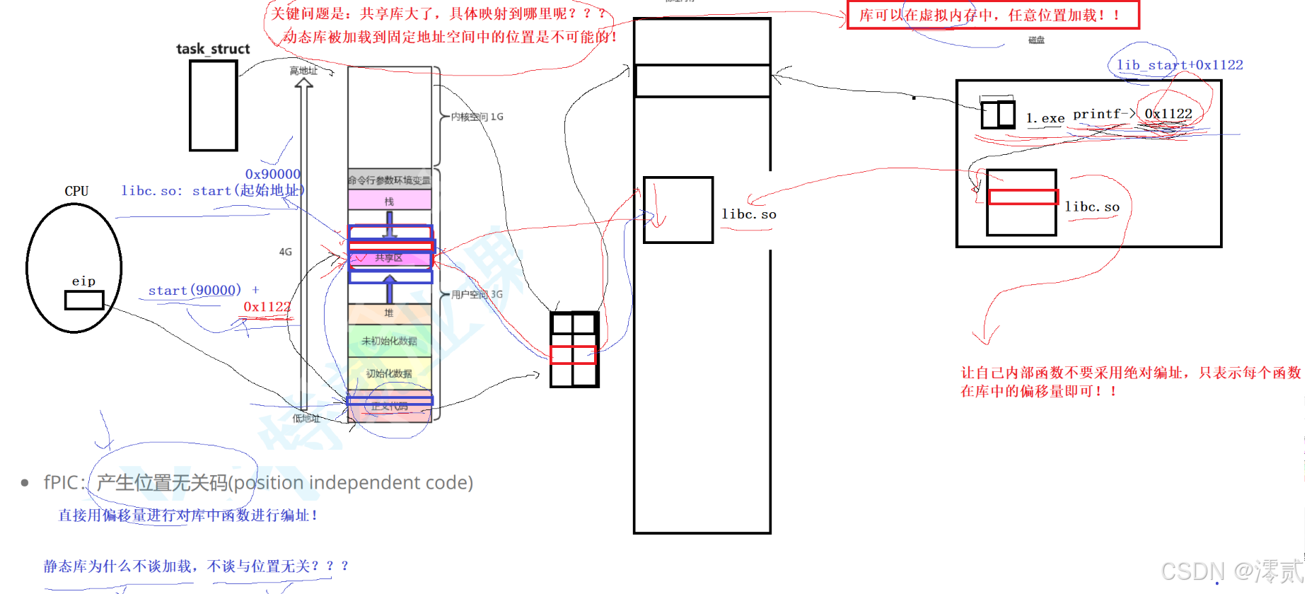 回到动态库的加载,动态库内的代码逻辑地址不是绝对地址,而是相对地址,因为动态库被加载到固定地址位置是不可能的,不仅麻烦还难映射,相对地址简单来说就是相对动态库起始地址而变化的,这样不管动态库放在共享区哪里,只要知道起始地址都能找到想要的代码,这也是为什么动态库编译时要加上 -fPIC