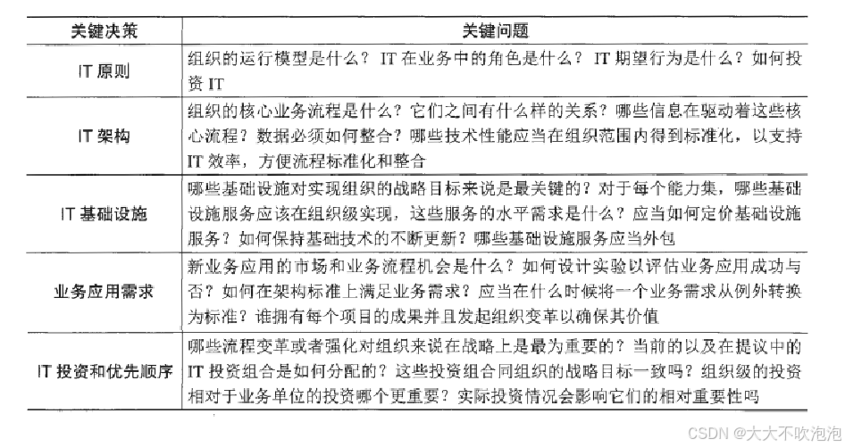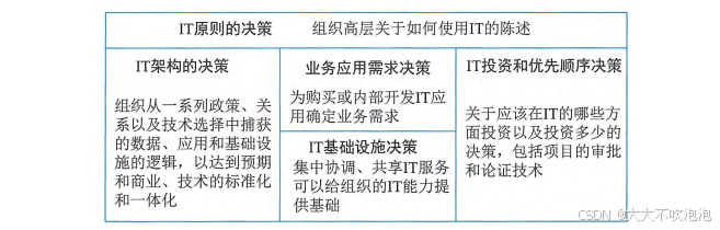 有效的IT治理必须关注5项关键决策,包括:IT原则、IT架构、IT基础设施、业务应用需求、IT投资和优先顺序。