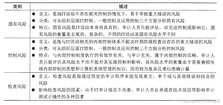 IT审计风险主要包括固有风险、控制风险、检查风险和总体审计风险。固有风险、控制风险、检查风险的内容如表所示。