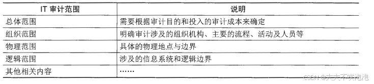 一般来说,IT审计范围需要根据审计目的和投入的审计成本来确定。在确定审计范围时,除了考虑前面提及的审计内容外,还需要明确审计的组织范围、物理位置以及信息系统相关逻辑边界。