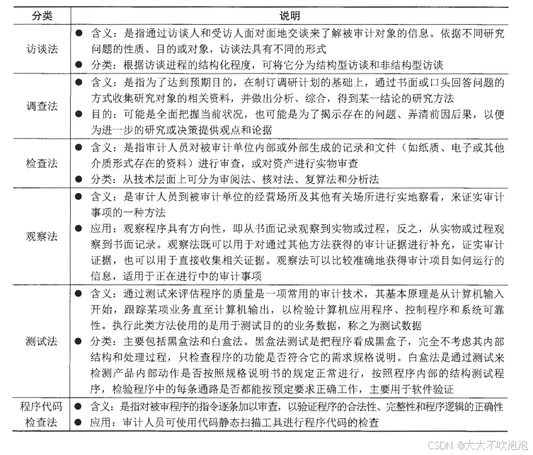 常用审计方法包括访谈法、调查法、检查法、观察法、测试法和程序代码检查法等