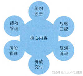 IT治理本质上关心:(1)实现IT的业务价值;(2)IT风险的规避。前者是通过IT与业务战略匹配来实现的,后者通过在组织内部建立相关职责来实现。两者都需要相关资源的支持,并对其绩效进行有效度量。IT治理的核心内容包括6个方面,即组织职责、战略匹配、资源管理、价值交付、风险管理和绩效管理。