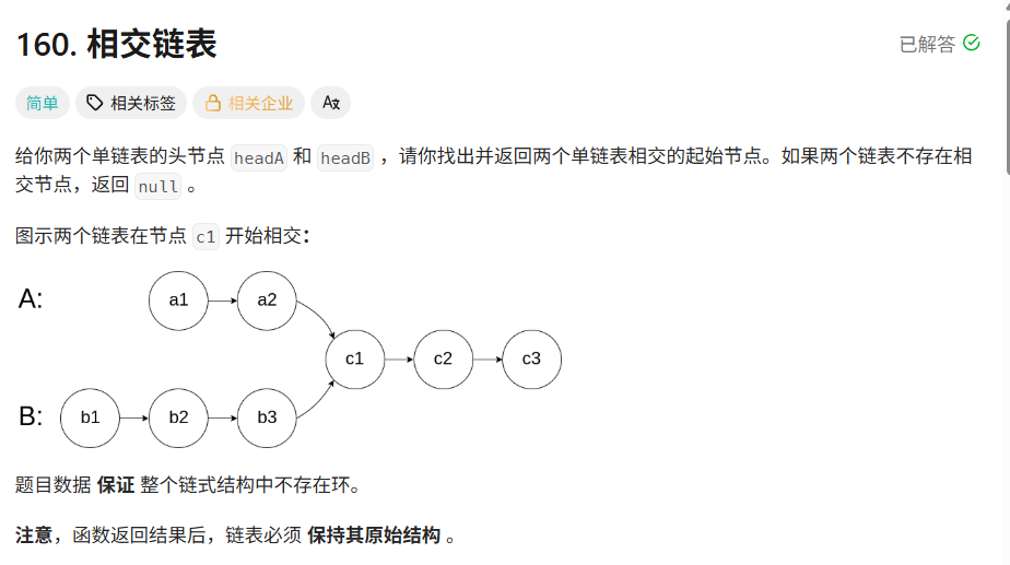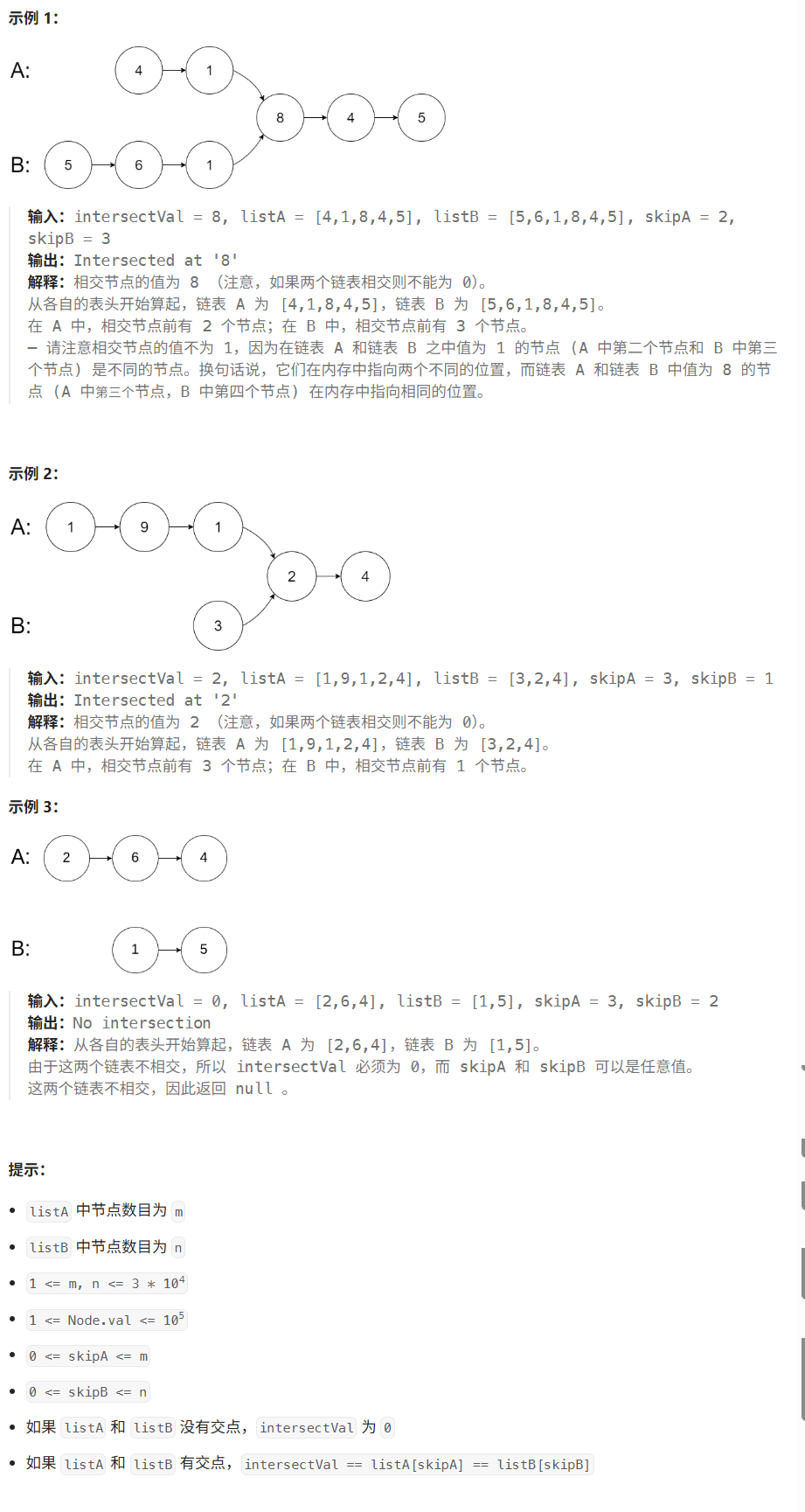 题目链接 :https://leetcode.cn/problems/intersection-of-two-linked-lists/description/