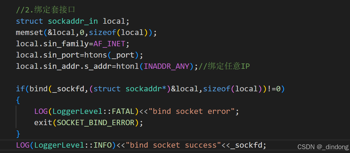 4.填充完服务器网络相关的属性信息后,需要调用bind函数进行绑定。绑定实际就是将文件与网络关联起来,如果绑定失败也没必要进行后续操作了,直接终止程序即可。
