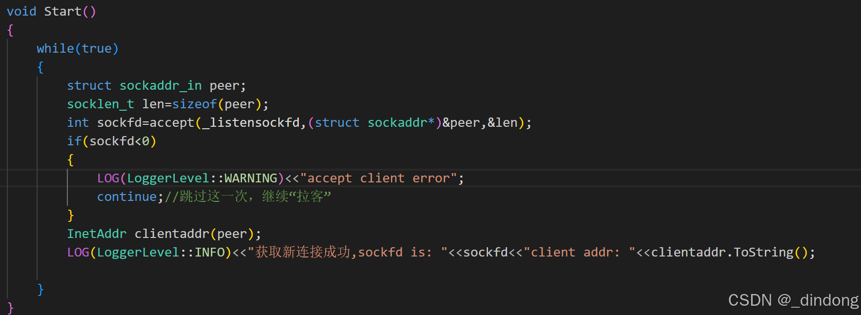 1.accept函数获取连接时可能会失败,但TCP服务器不会因为获取某个连接失败而退出,因此服务端获取连接失败后应该继续获取连接。
