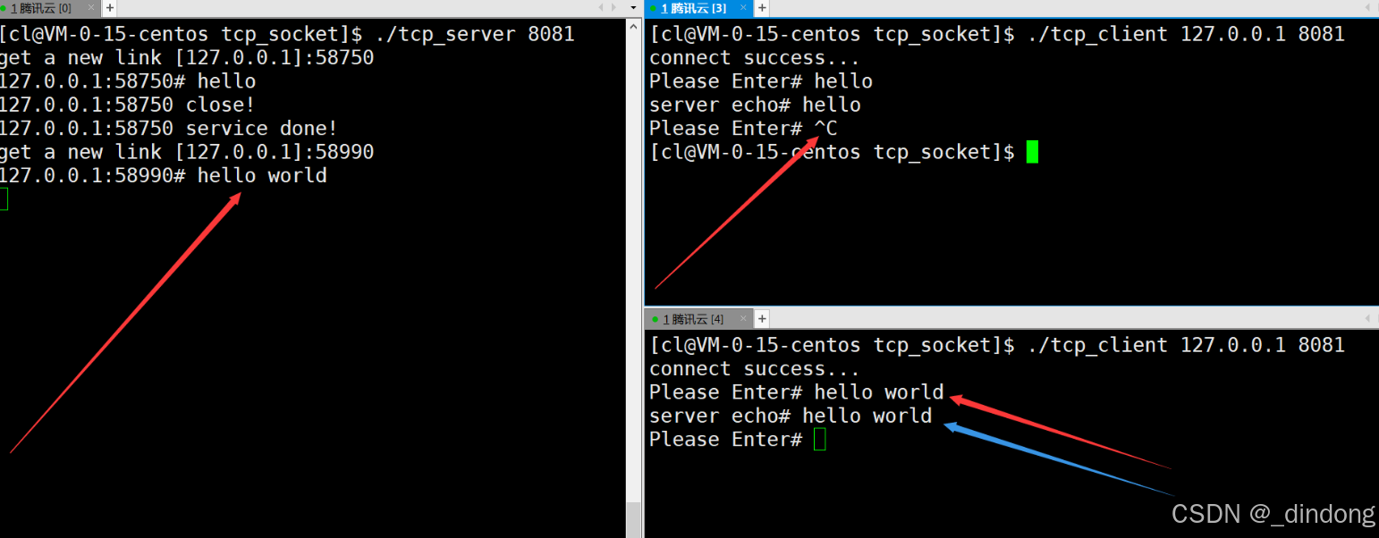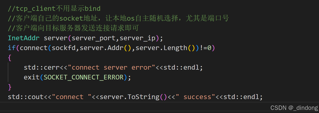 需要注意的是,客户端不是不需要进行绑定,而是不需要我们自己显示进行绑定操作(bind),当客户端向服务端发起连接请求时,系统会给客户端随机指定一个端口号进行绑定。因为通信双方都必须要有IP地址和端口号,否则无法唯一标识通信双方。也就是说,如果connect函数调用成功了,客户端本地会随机给该客户端绑定一个端口号发送给对端服务器。