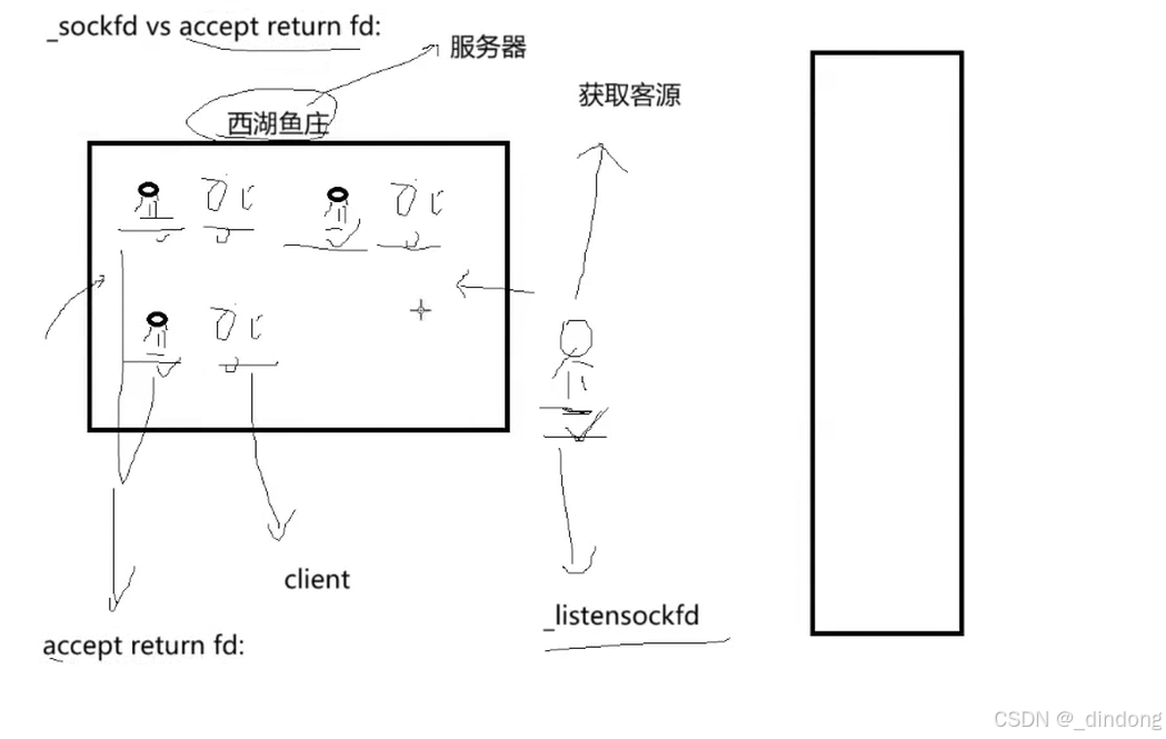 就像一个饭店,饭店就堪比一个服务器,店内一桌一桌客人就是客户端,饭店里有负责店外拉客的,也有负责店内招待客人的,负责拉客的就是监听套接字,负责服务客人的就是accept返回的套接字。
