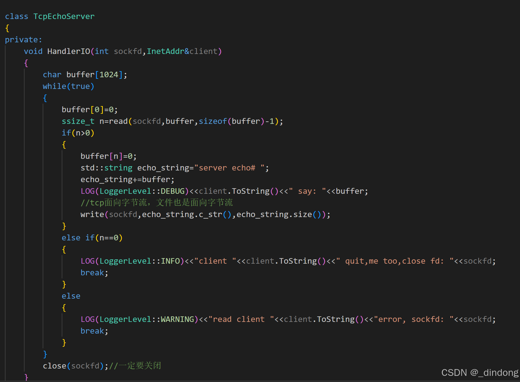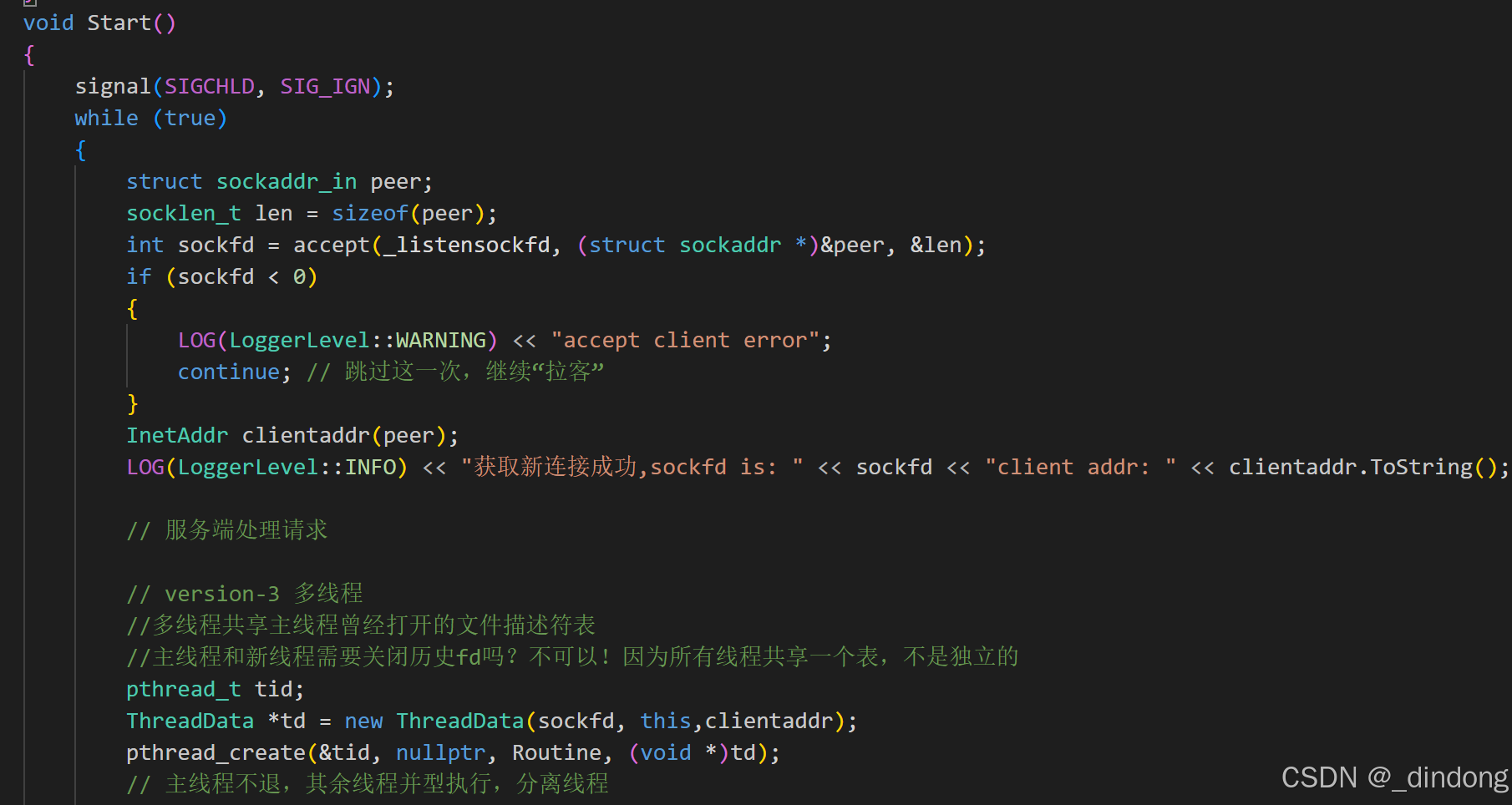 由于TCP服务器初始化时需要服务器的端口号,因此在服务器类当中需要引入端口号,当实例化服务器对象时就需要给传入一个端口号。而由于我当前使用的是云服务器,因此在绑定TCP服务器的IP地址时不需要绑定公网IP地址,直接绑定INADDR_ANY即可,因此我这里没有在服务器类当中引入IP地址。