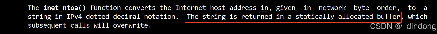 3.inet_ntoa函数在底层实际做了两个工作,一是将网络序列转换成主机序列,二是将主机序列的整数IP转换成字符串风格的点分十进制的IP。