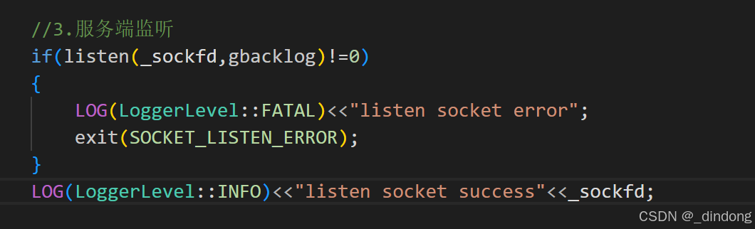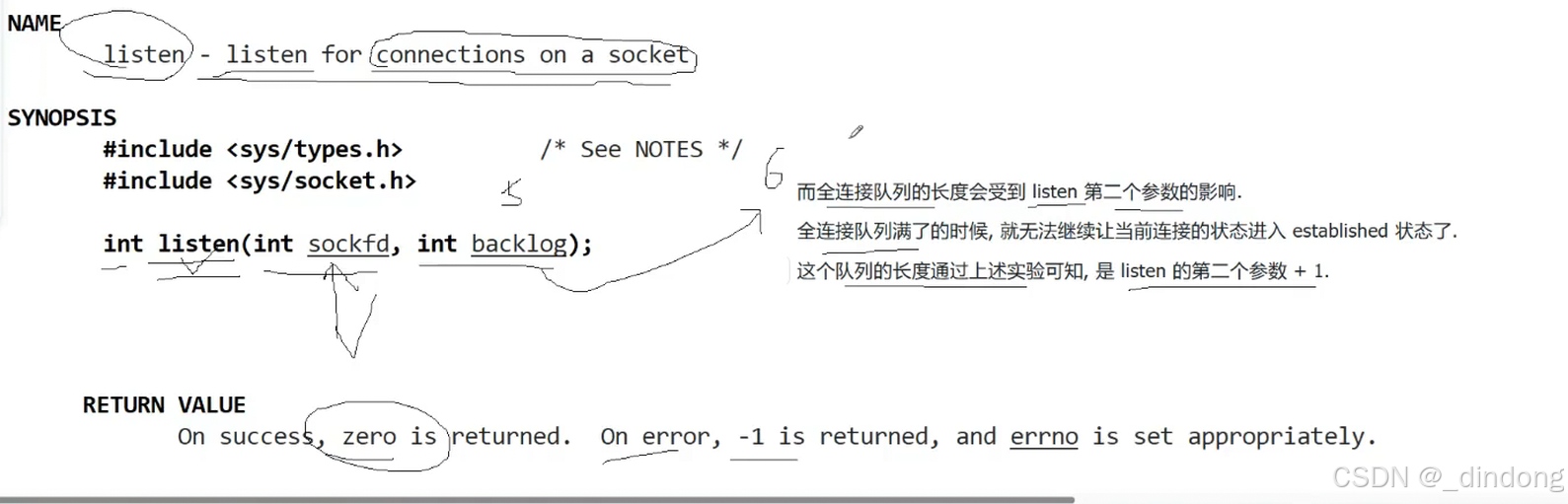 第二个参数,为全连接队列的长度减去1。全连接队列如何理解,就像餐饮店来了很多人点餐,这些人需要排队点餐,最多只能有6个人排队,那么backlog就设置为5.一般不设置太大(8,16,32)